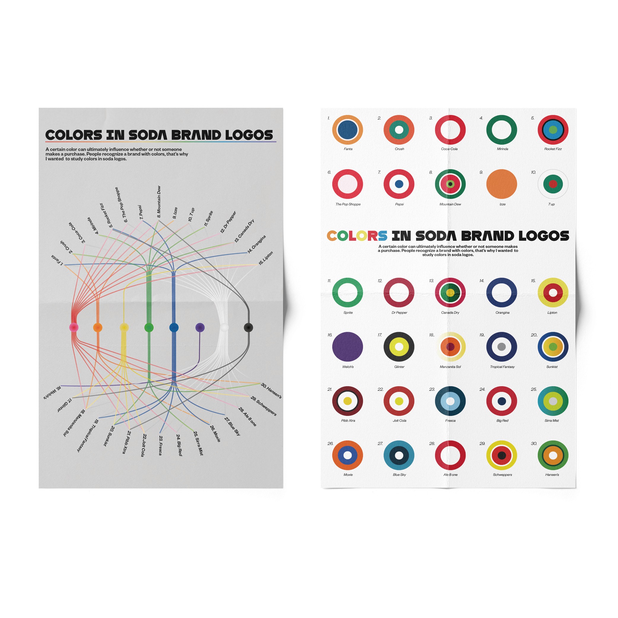 This infographic translates soda brand identities into a geometric visual language, mapping color relationships through precise form and structure. It turns data into storytelling, revealing how color functions as a defining and recognizable element of each brand.