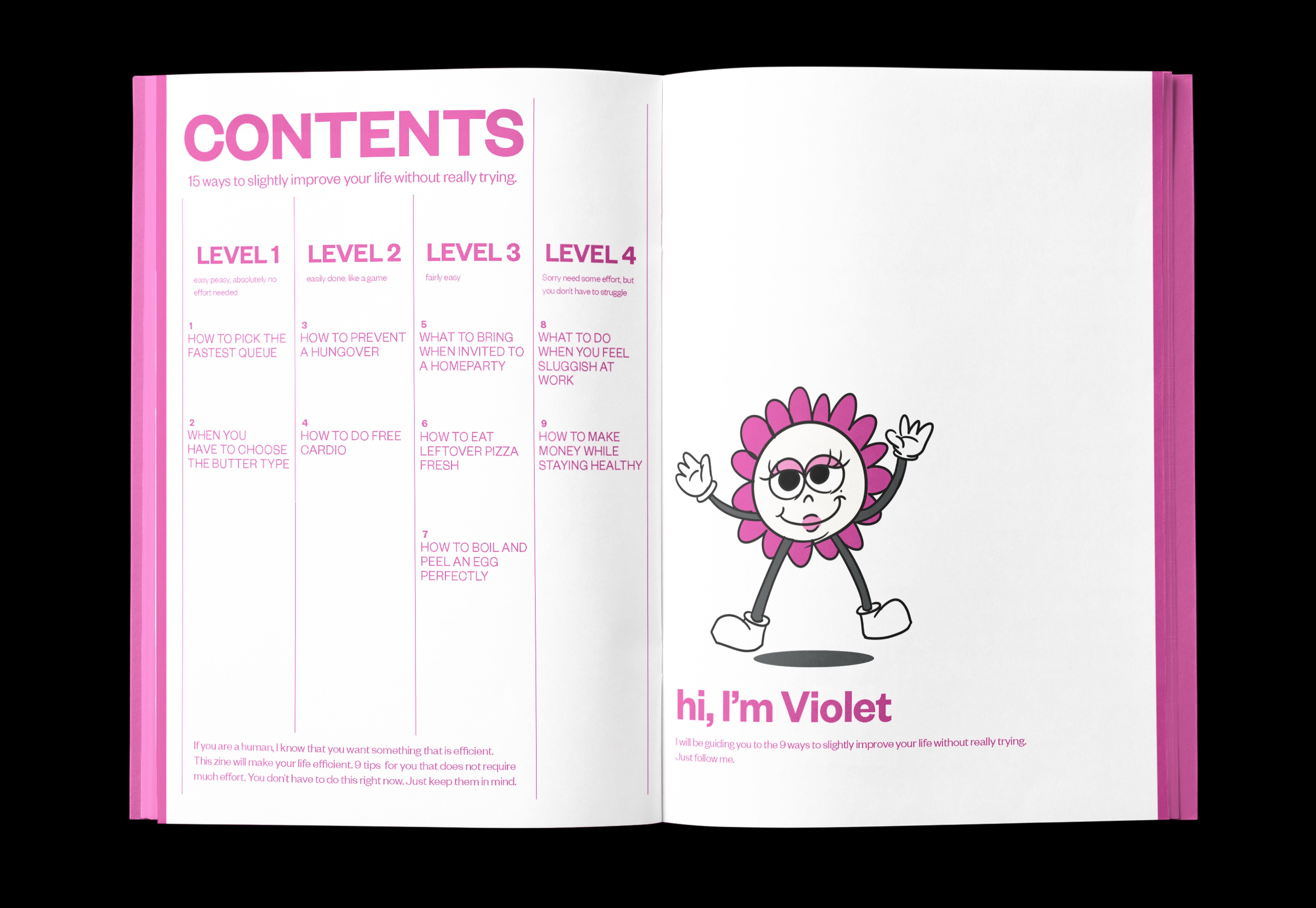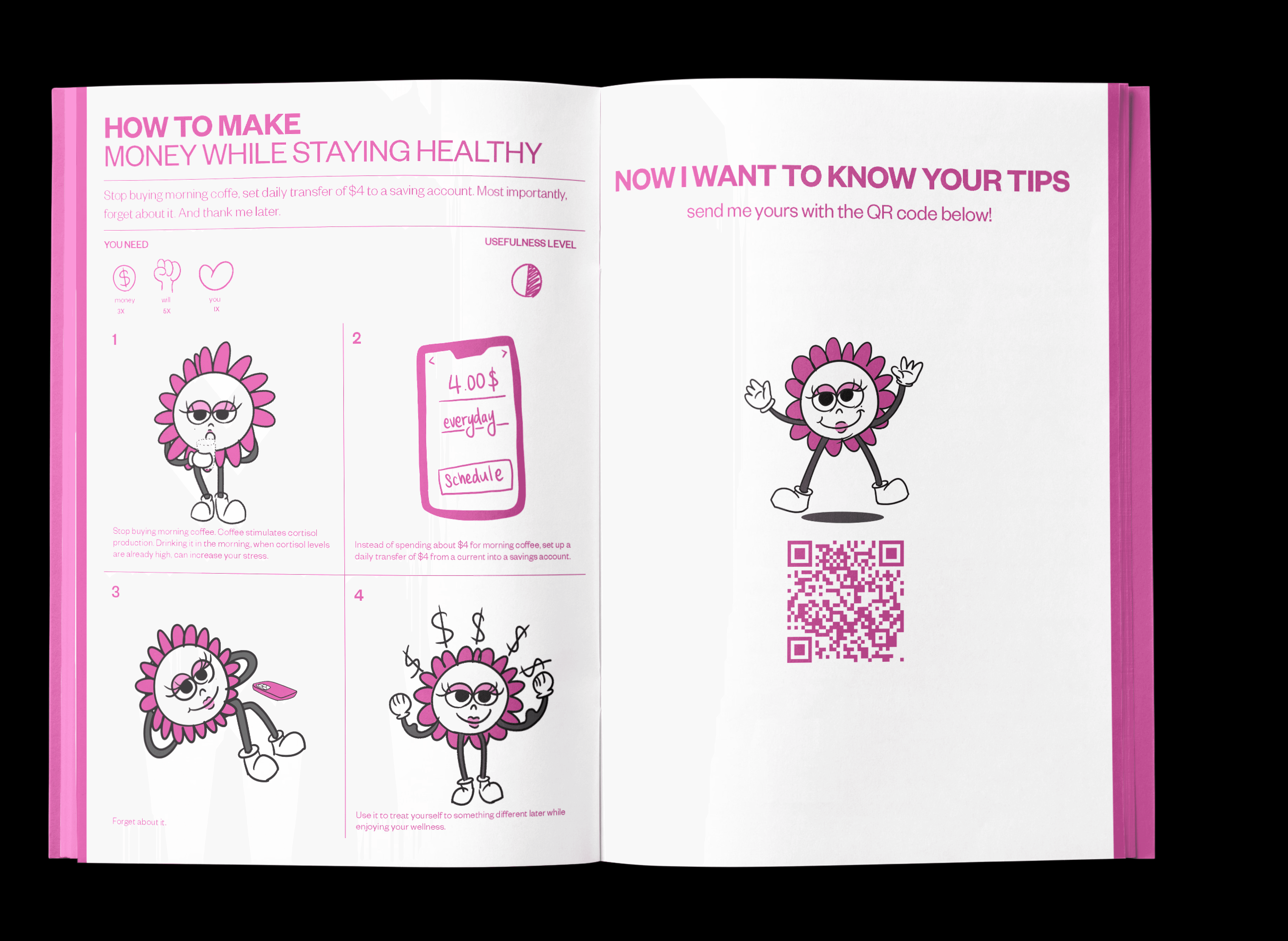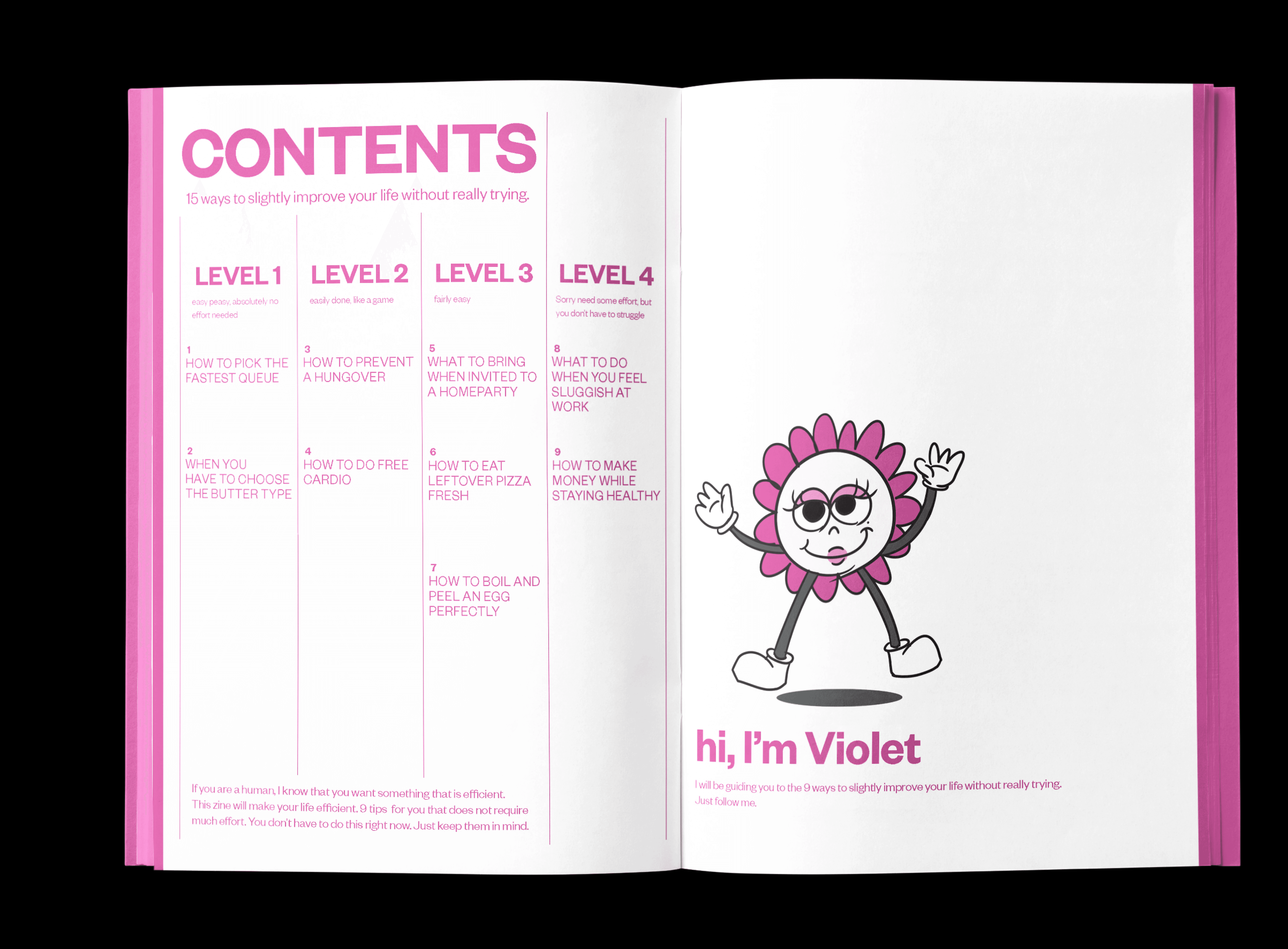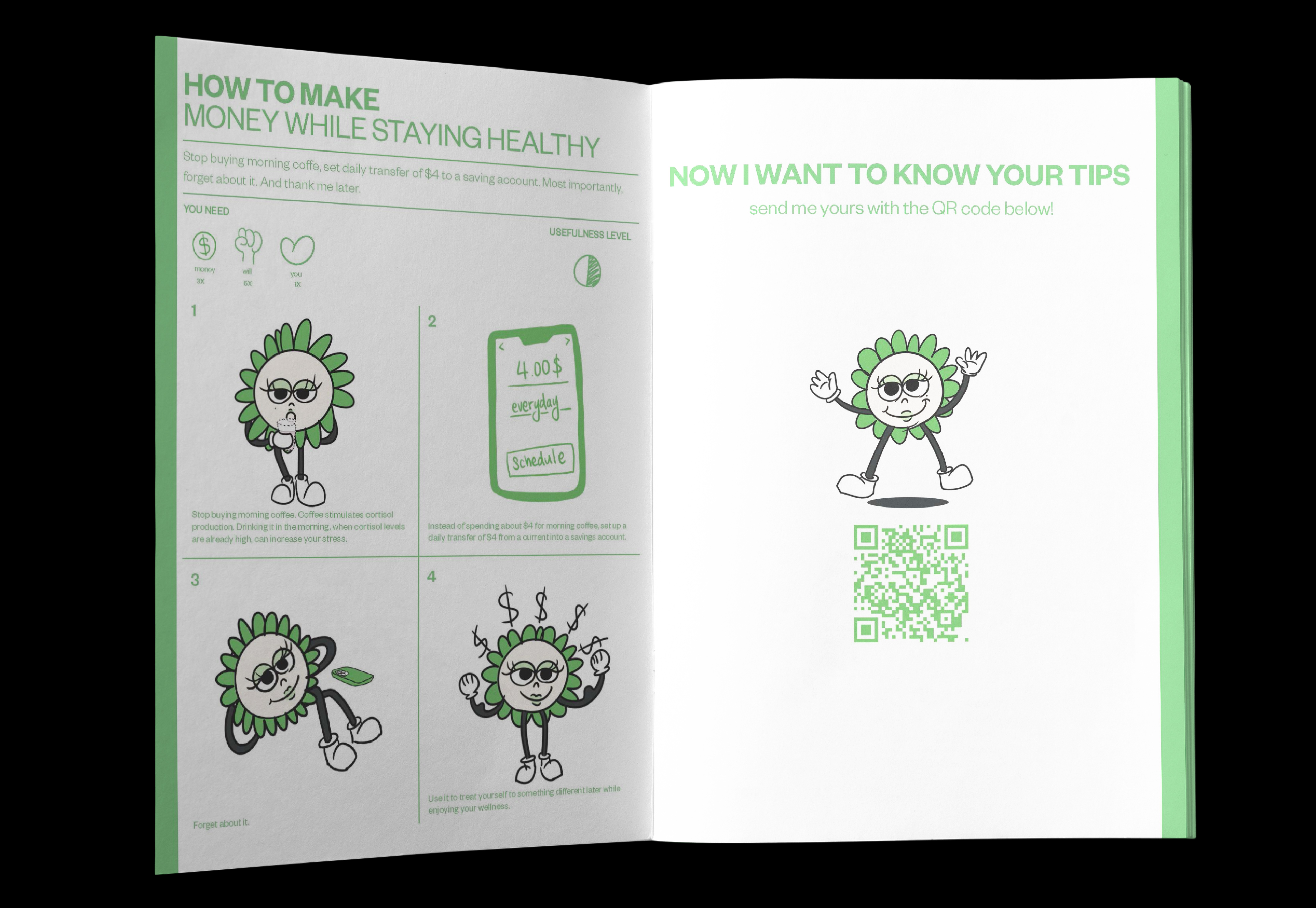 Life Tip Book is an editorial zine that delivers everyday advice through a character-driven visual and typographic system. Designed from concept to production, the project includes content creation, illustration, layout, and hand-crafted binding.