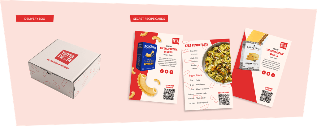 Three pastas and three curation cards arrive at your door in a charming Tutta Pasta box.